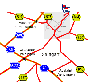 Von München auf der A 8 bis Ausfahrt Wendlingen, Richtung Esslingen auf der B 10, Uferstraße, nach Stuttgart - Bad Cannstatt, an der Wilhelma (Neckartalstraße) vorbei und dann immer gerade aus Richtung Münster. Ab der Shell-Tankstelle weiter wie oben beschrieben.